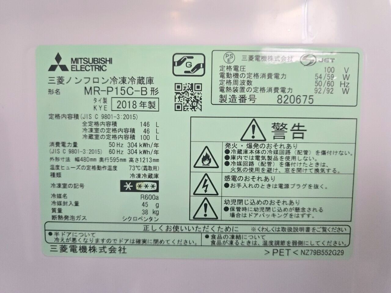 [1075]MITSUBISHI, refrigerator, MR-P15C-B, made in 2018, 冰箱