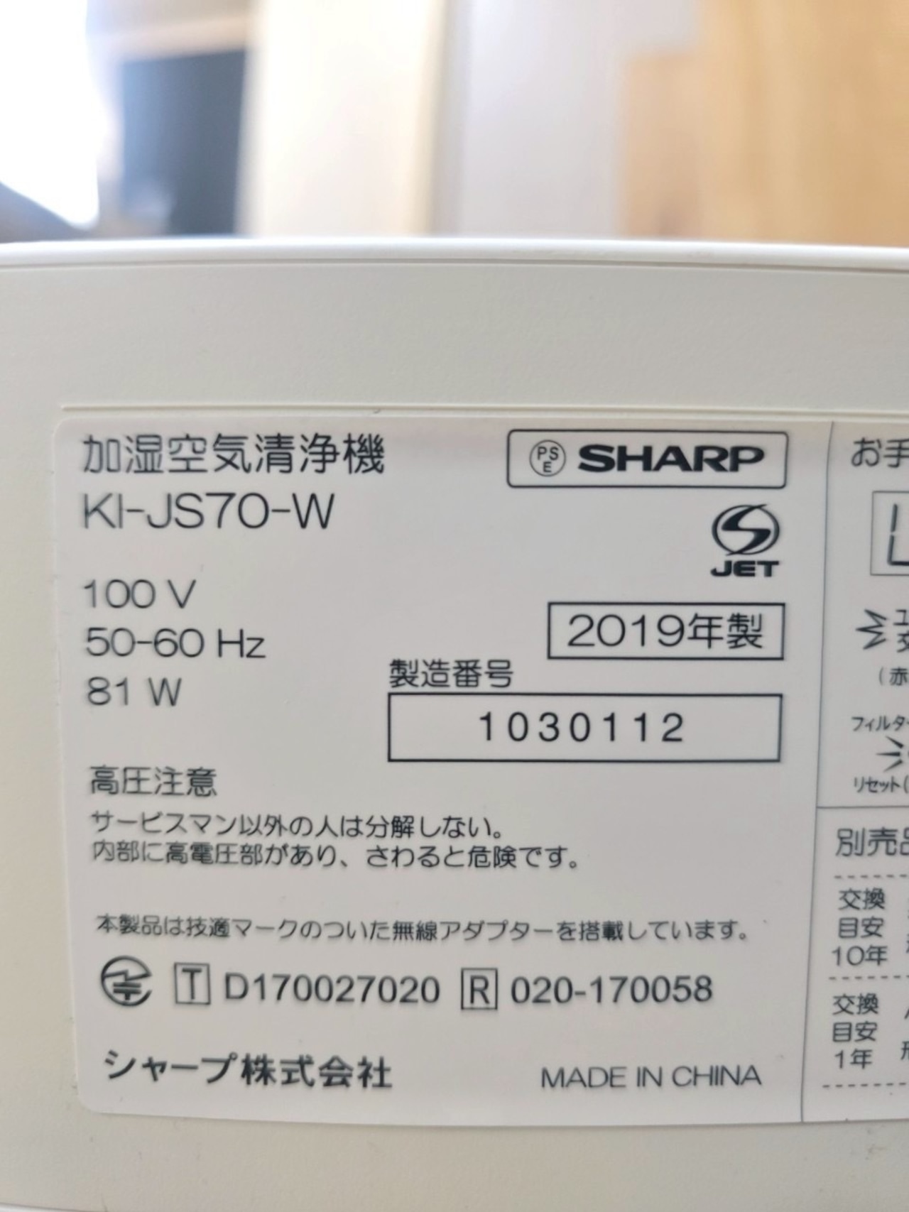 [1129]SHARP, air purifier with humidifying, KI-JS70-W, made in 2019, 加濕空氣清淨機