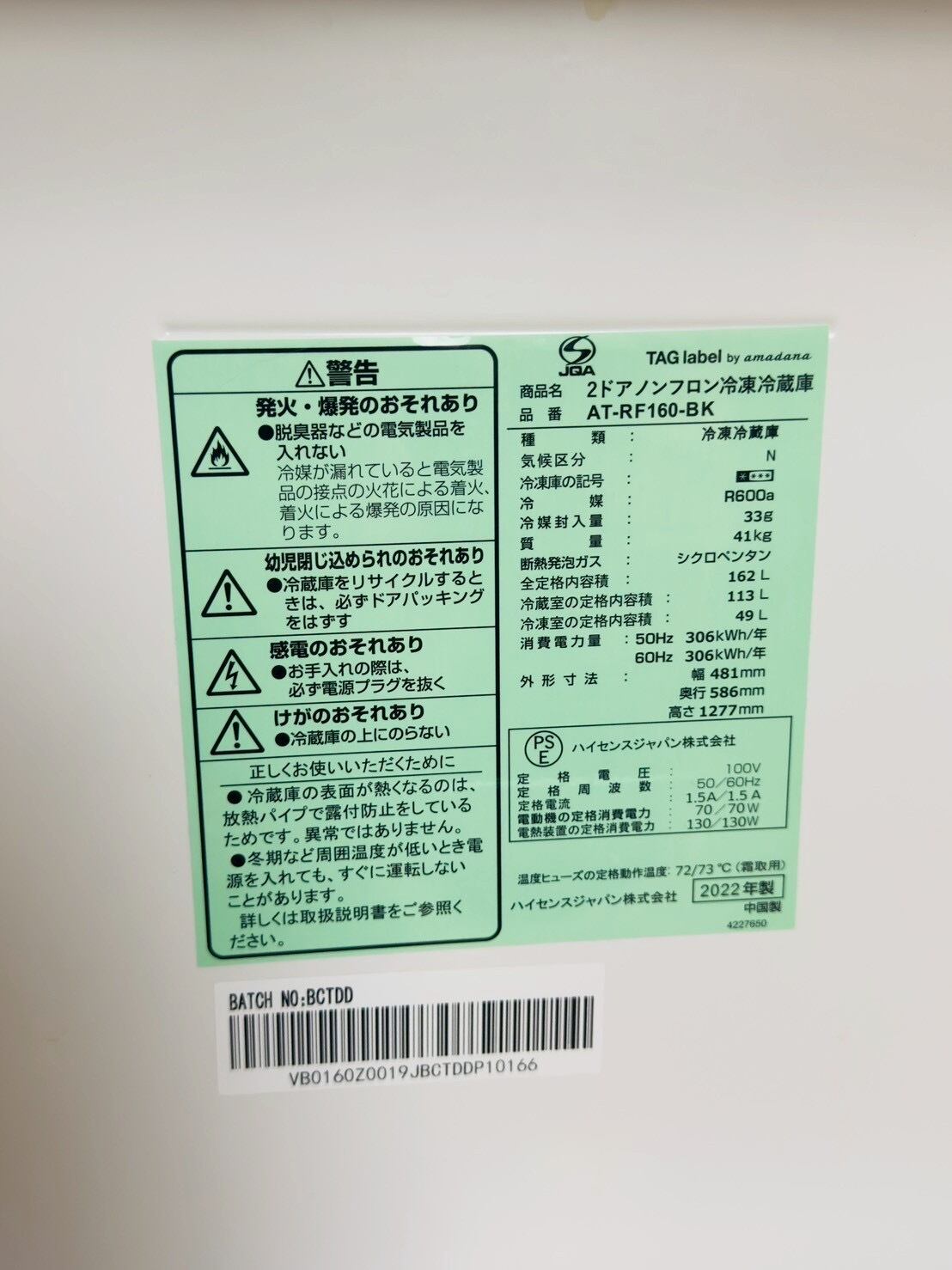 [1224]TAG label, refrigerator, AT-RF160-BK, made in 2022, 冰箱